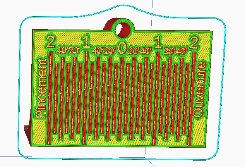 Sur les photos le plomb est rangé (dans son bel étui pharmaceutique :P ) mais évidemment en usage il pend et le fil devant la graduation donne l’inclinaison de la roue.