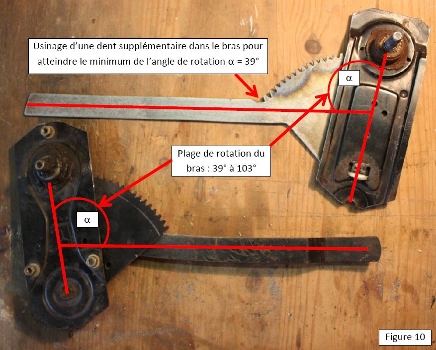 La figure 10 montre la crémaillère installée dans la plaque support. Pour respecter l’angle de rotation minimal du bras (alpha =39°), il a fallu usiner une dent supplémentaire dans celui-ci.