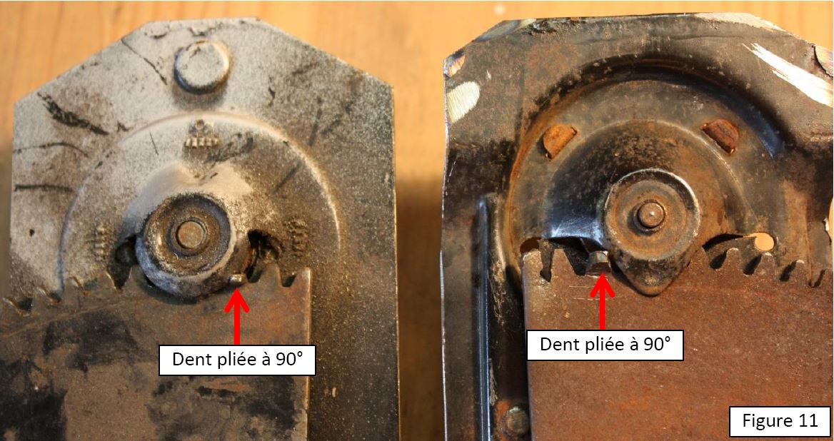 En respectant ces règles, on peut avoir des dents de forme patatoïdale sans gêner outre mesure le fonctionnement du mécanisme d’entrainement. Au pire on aura un léger jeu, de quelques degrés au changement de rotation de la crémaillère. Une confirmation que la forme des dents est relativement secondaire est apportée par l’examen de la crémaillère de la portière droite. Sur la figure 5 on observe que dans la zone la plus usitée, les dents sont fortement usées ; il n’en reste plus qu’un moignon acéré. Les dents dans la zone qui ne voit pas souvent, ou pas du tout (au-delà de l’ergot d’arrêt de la rotation) le pignon d’entrainement, ont gardé une forme régulière grossièrement sinusoïdale. Cependant, ce mécanisme fonctionne parfaitement, sans jeu significatif. Tout ceci pour en venir au fait que la crémaillère peut être réalisée à la main, même si comme l’auteur, on a deux mains gauches.