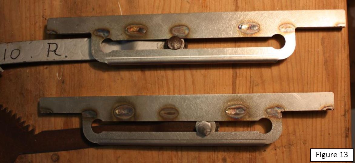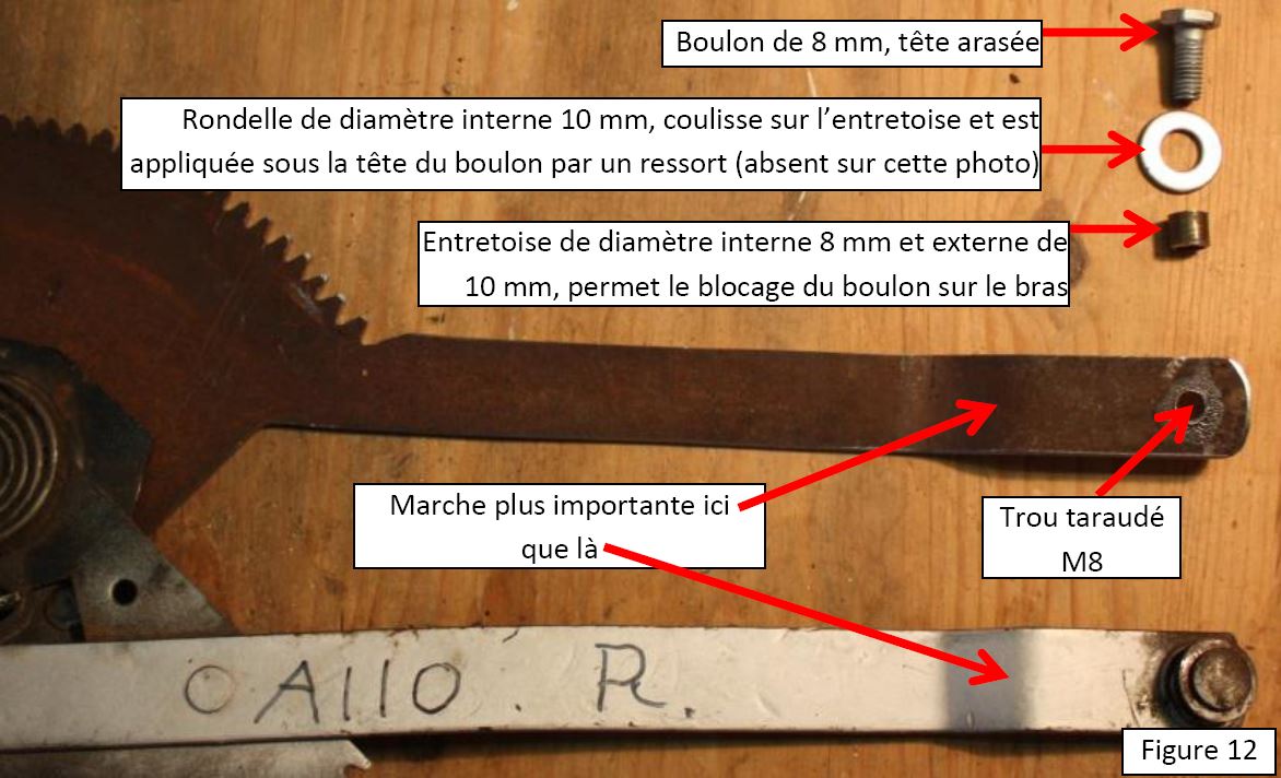 L’étape suivante est le pliage et la mise à la longueur du bras. A noter que sur la version monobloc de l’ensemble crémaillère-bras, étant donné que le bras est dans le prolongement du triangle et non plus fixé dessus, la marche de pliage doit être plus importante, augmentée de la valeur de l’épaisseur du triangle original (2,2 mm ici). L’extrémité du bras est ensuite percée et taraudée afin de recevoir le pion de guidage venant s’insérer dans la glissière support de vitre. Ce pion est un simple boulon de 8 mm, dont la tête a été légèrement arasée, et qui est boulonné dans le bras en venant s’appuyer sur une entretoise de 10 mm de diamètre externe afin de respecter le diamètre du pion du mécanisme originel. Le ressort qui vient appliquer la rondelle coulissant sur l’entretoise sous la tête du boulon, n’est pas présent sur la figure 12 et sera installé ultérieurement. L’extrémité filetée du boulon engagée dans le bras est ensuite arasée pour ne pas dépasser. Ce boulon est bloqué avec de la Loctite®. La figure 13 montre les pions engagés dans les glissières support de vitre.