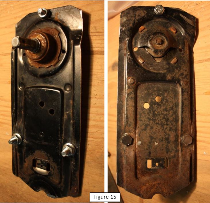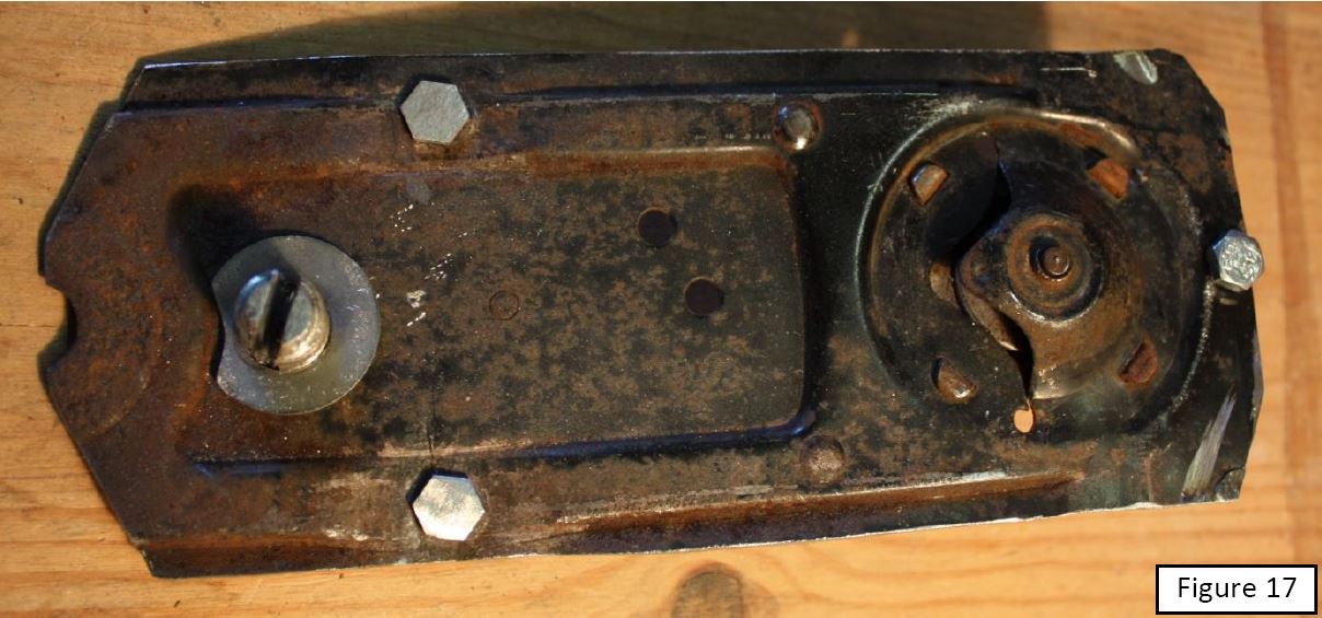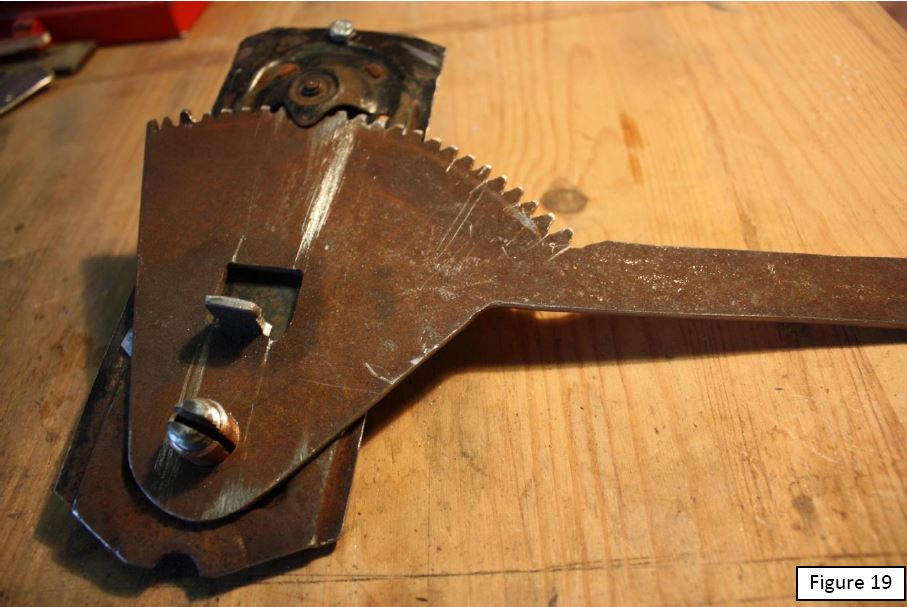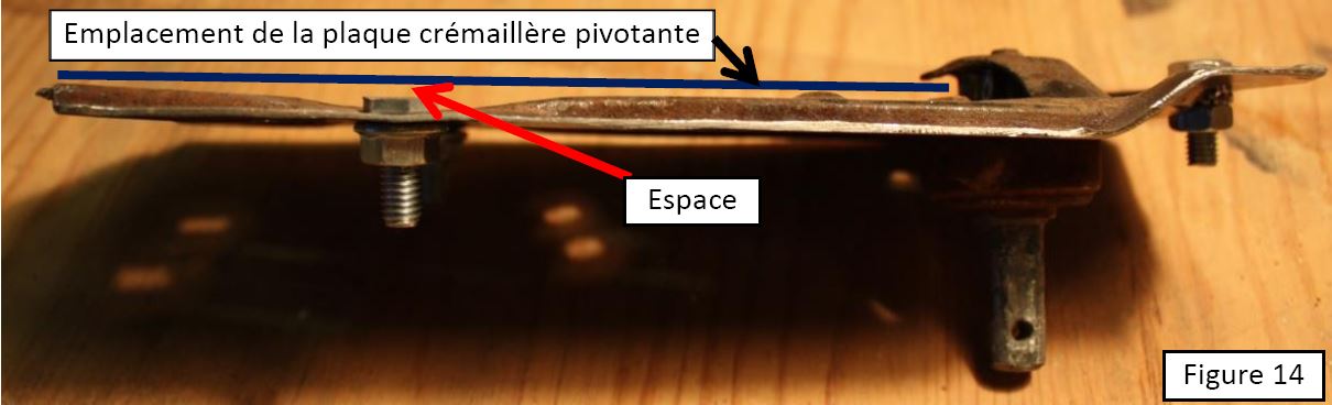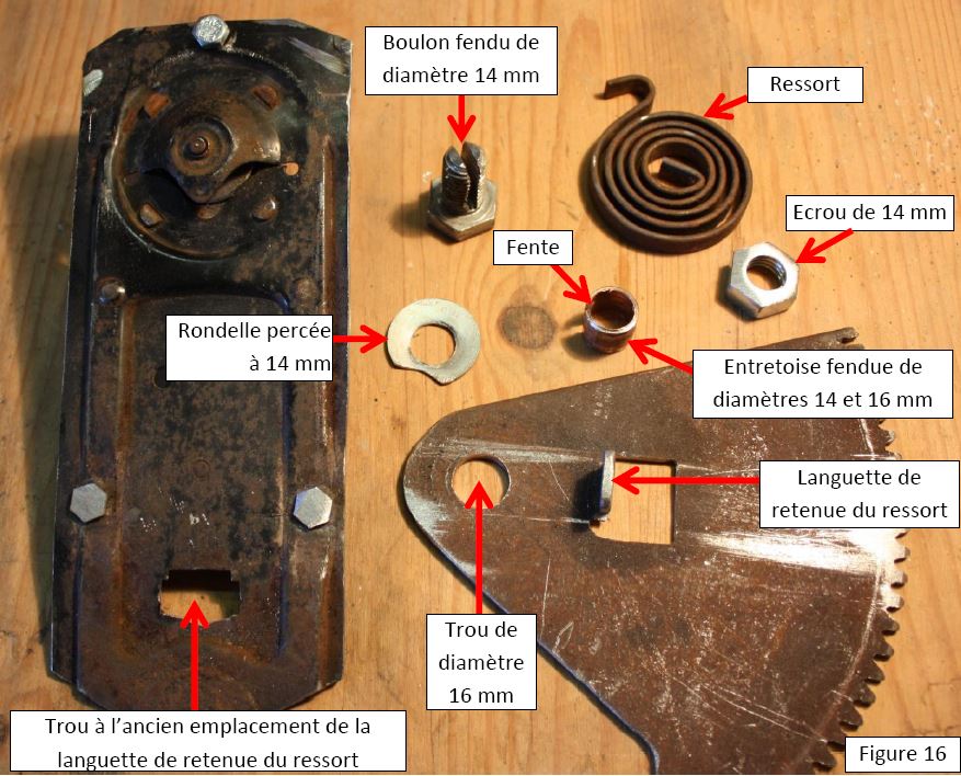 La dernière étape consiste à fixer la plaque crémaillère sur la plaque du mécanisme. Dans toute cette fabrication, c’est le travail qui s’est révélé le plus délicat. En effet, d’une part il s’agit d’accoler deux pièces dont l’une est mobile par rapport à l’autre et d’autre part, de placer un axe dans un endroit où il n’y a plus de matière. Ceci parce qu’une fois percé au diamètre 14 mm, l’ancienne languette de retenue du ressort a totalement disparu. Malheureusement, le trou rectangulaire restant après la disparition de la languette est juste à l’endroit où l’axe de rotation de la crémaillère est situé sur un mécanisme d’A110. Par conséquent il a fallu suppléer ce manque de matière par des surfaces de portée assez grandes (gros boulon et rondelle large, voir figure 16). L’idéal aurait été de souder la rondelle percée à 14 mm sur la plaque pour rétablir l’intégrité de cette dernière à l’endroit de blocage de l’extrémité extérieure de l’ancien ressort d’assistance, mais souder une rondelle de 2 mm d’épaisseur sur une plaque pas plus épaisse réclame une certaine dextérité (que je n’ai pas).