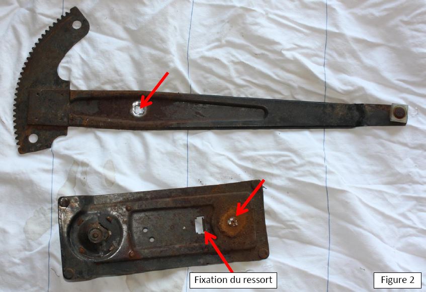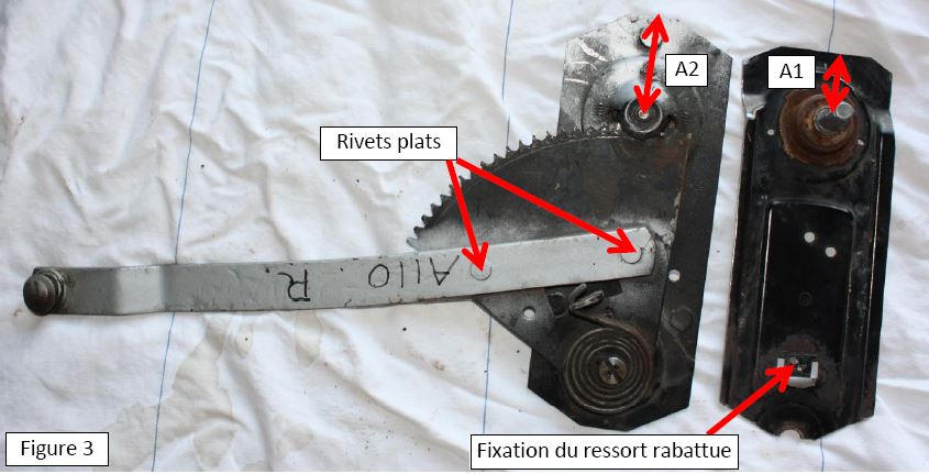 Ensuite, la plaque crémaillère a été retaillée car trop longue et trop large par rapport à celle du mécanisme d’A110. Toutefois on notera que la distance entre l’axe du mécanisme de la crémaillère et le bord supérieur de la plaque est plus petite sur la plaque de Caravelle (A1 sur la figure 3) que sur la plaque d’A110 (A2 sur la figure 3). Ceci n’est pas gênant dans la mesure où la position du boulon supérieur de fixation de la plaque a une certaine liberté de positionnement sur la portière ; c’est l’axe et l’orientation de la crémaillère qui doivent être positionnés précisément. La fixation du ressort doit aussi être rabattue (figures 2 et 3).