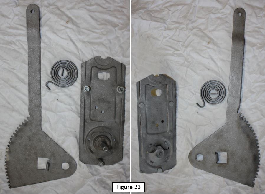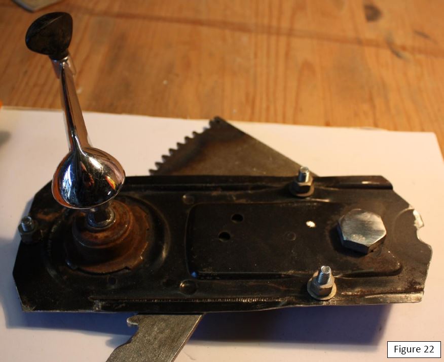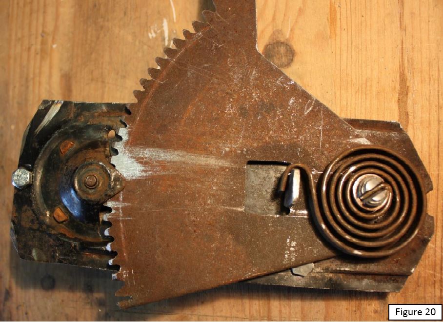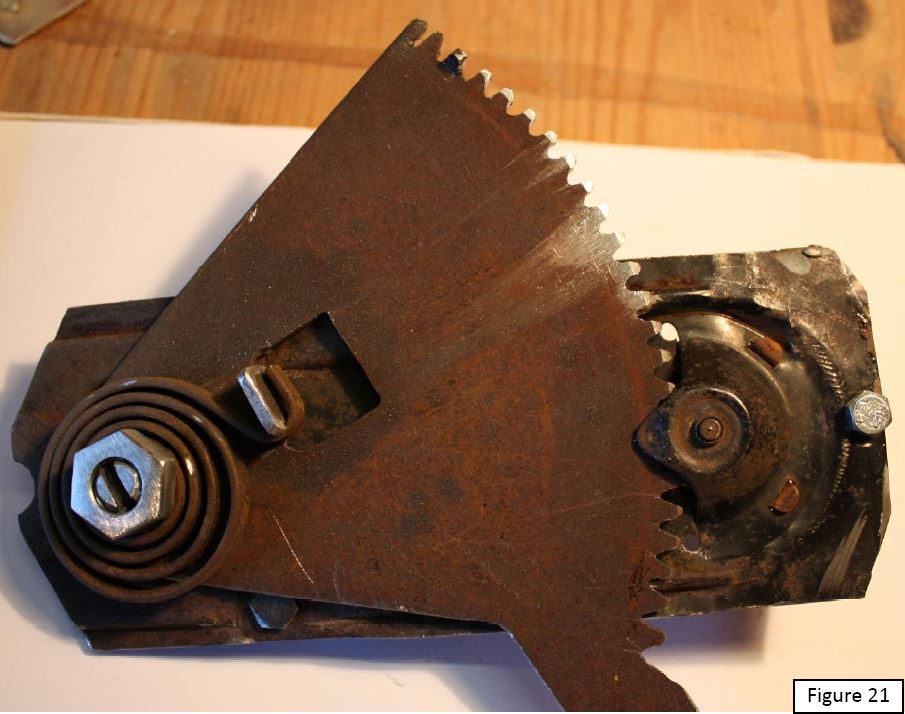 La figure 22 montre le mécanisme reconstitué. Il est à noter que si le gros boulon tourne, on peut le bloquer avec un point de soudure ; cependant dans ce cas, le réglage de la tension du ressort devient moins facile.