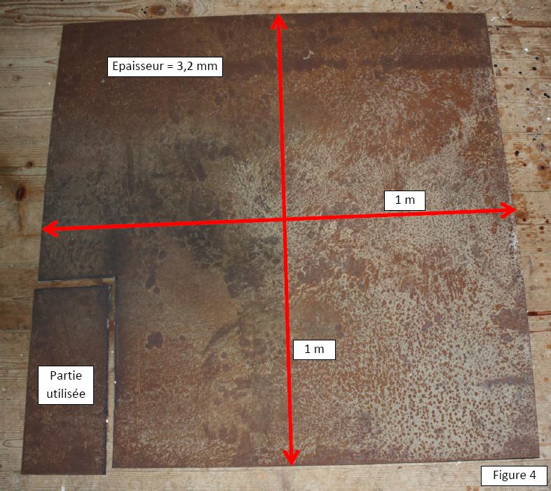 En définitive, cette dernière raison se suffirait à elle-même. En effet, le bras est fixé à la crémaillère par de gros rivets plats qui ne doivent quasiment pas dépasser de la crémaillère sinon ils viennent buter contre la plaque support du mécanisme lors de la rotation de la crémaillère. Il est à noter que la taille importante de ces rivets est liée au fait que le bras doit être fixé très fermement à la crémaillère. Comme il est difficile de reproduire un tel assemblage, il a été opté pour un ensemble crémaillère/bras monobloc et non plus bi-bloc. La formule monobloc permet ainsi d’éviter un contact éventuel entre la crémaillère et la plaque en raison de rivets protubérants, et permet une liaison bras-crémaillère extrêmement solide. Le bras faisant une épaisseur de 3, 2 mm, le nouvel ensemble bras-crémaillère a été taillé également dans une plaque de 3,2 mm d’épaisseur. La figure 4 montre le morceau découpé à la meuleuse dans la plaque mère de dimensions 1x1 m.