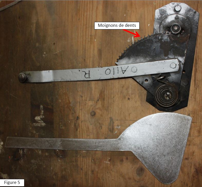 3- On n’utilisera que des outils banaux, que l’on trouve dans tout atelier de base : perceuse, meuleuse et scie sauteuse. On n’utilisera ni tour, ni fraiseuse, ni poste à souder. Donc ce travail est à la portée de n’importe quel bricoleur ayant les 3 outils de base cités précédemment. Sans outil d’usinage sophistiqué, il y a 2 choses qu’il est impossible de fabriquer : la cage d’entrainement de la crémaillère et le ressort de rappel. Aussi, ces deux éléments et eux seuls seront récupérés sur un mécanisme de Caravelle. Le bras a tout d’abord été désolidarisé de la plaque comportant le mécanisme d’entrainement de la crémaillère en limant l’axe-rivet (figure 2).