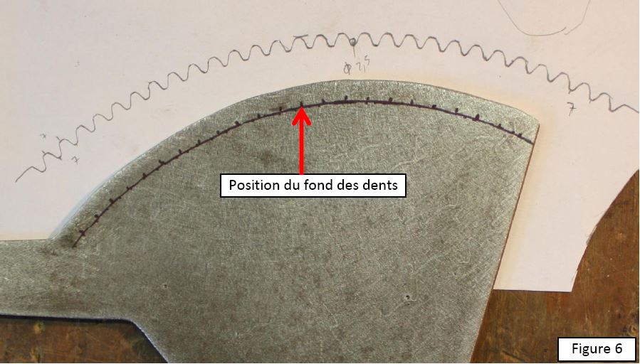 La première étape consiste à tracer sur un papier la forme de la crémaillère d’origine pour en mesurer les principales caractéristiques : pas (7 mm), hauteur (7 mm) rayon de courbure des dents (2,5 mm) (figure 6). La seconde étape consiste à tracer sur la pièce la position du fond des dents (figure 6).