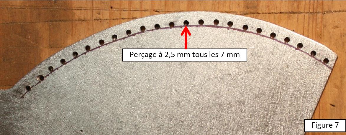 La troisième étape consiste à percer des trous de 2,5 mm de diamètre, espacés de 7 mm et venant tangenter la ligne à 7 mm du bord de la pièce (figure 7).