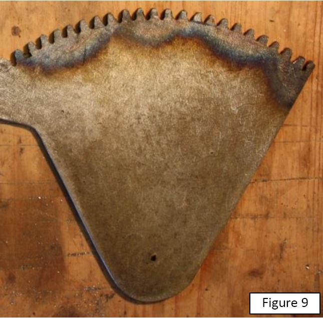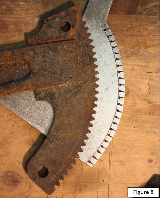 La quatrième étape consiste à usiner les dents à la scie sauteuse et à la lime à main, en commençant par faire une saignée à la scie à métaux entre les perçages et le bord de la plaque ( figure 8).