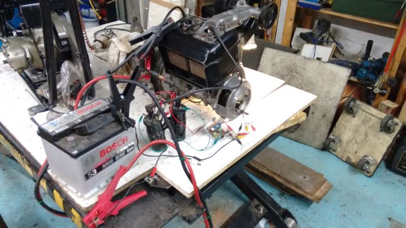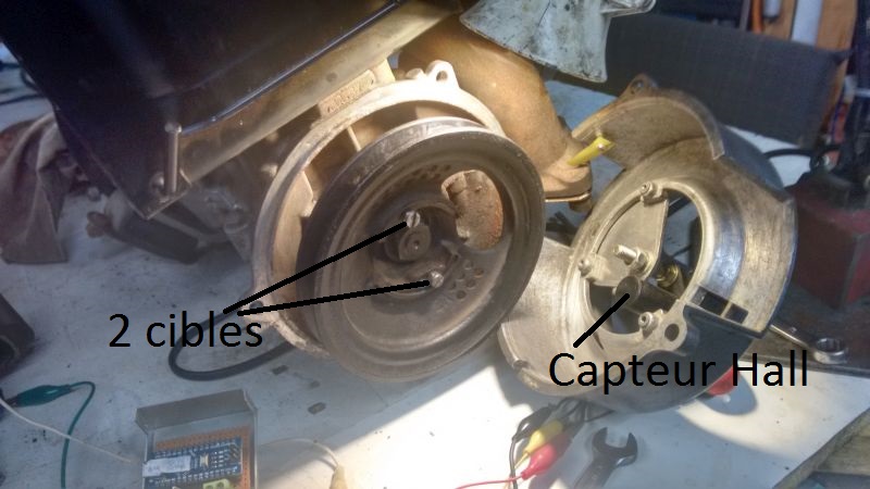 Sur ce prototype en câblage volant, un AEPL-duino lui a été adapté, avec un capteur Hall . Il y a donc une étincelle perdue par tour moteur (comme sur une 2 cv Citroën, par exemple).