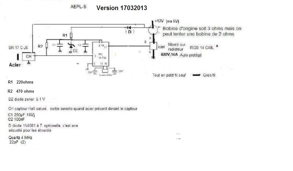 — L’AEPL-S, allumage électronique programmable, comprend un microcontrôleur Pic 16F84 (ou 628 ou 628A, voir les logiciel inclus) qui gère l’avance suivant une courbe préalablement programmée par l’utilisateur en fonction du régime moteur. Aucune avance à dépression n’est prise en compte. Il convient pour le moins à la masse, en 12V et aussi 6V ce qui n’était pas possible pour l’Aepl standard.