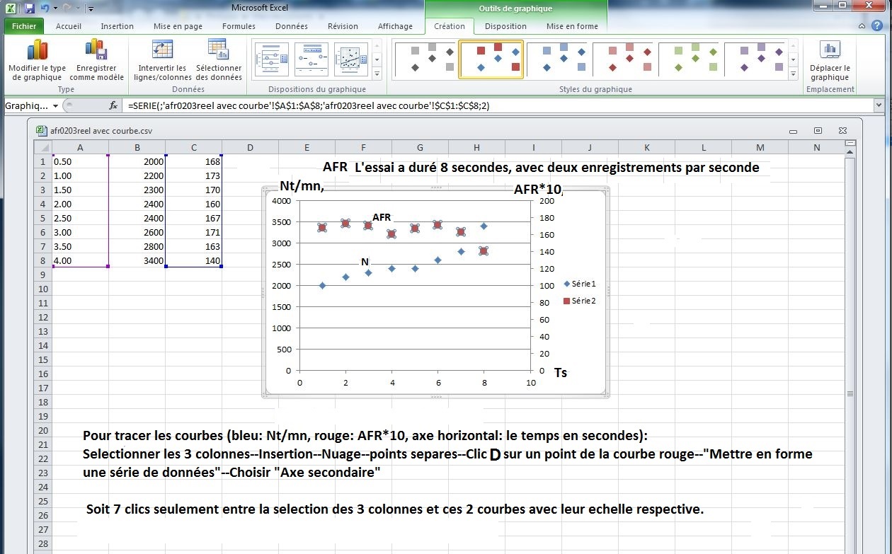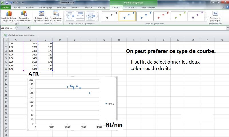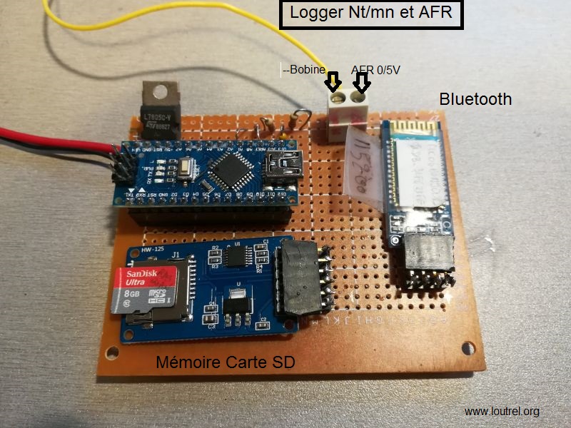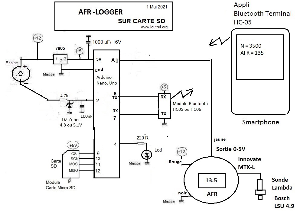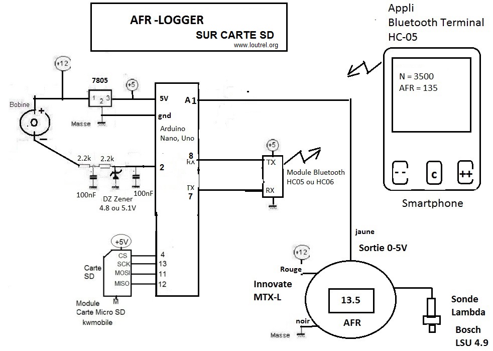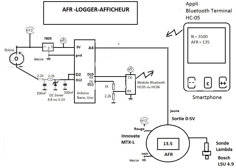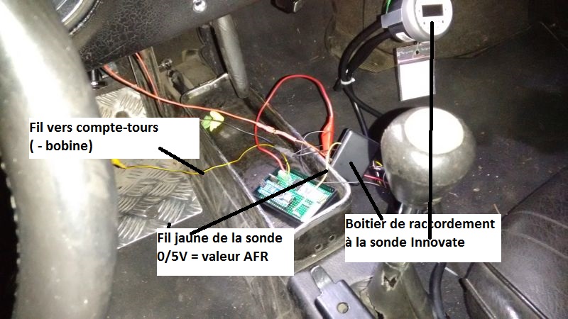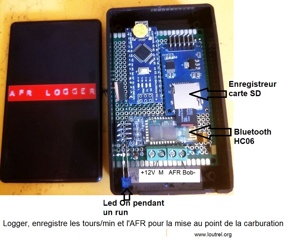 Lors d’essais de reglage de carburation avec une sonde lambda ( ici Innovate ), ce montage permet d’enregistrer plusieurs fois par seconde, les couples (Nt/mn, AFR).Ce même logiciel permet de relire et afficher les valeurs enregistrées sur l’écran moniteur de l’Arduino, puis sous Excel.
