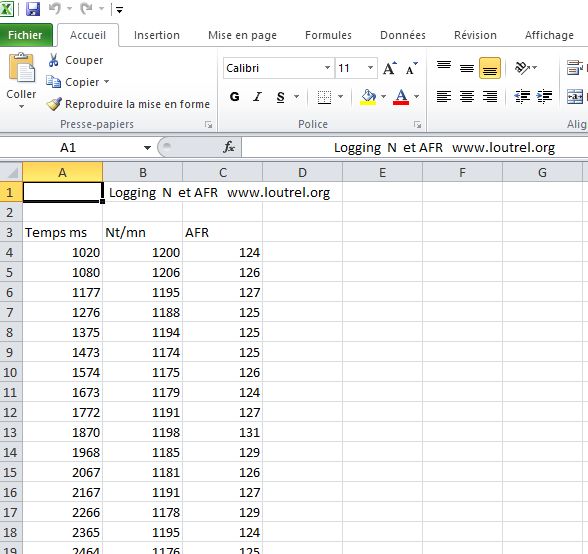 Faire un copié (Ctrl+C car la souris ne fonctionne pas dans ce cas ) de l’écran du moniteur (les trois colonnes) et un collé dans un simple éditeur de texte (type Notepad).On enregistre le fichier sous monAFR.csv ( et non .txt). Cette extension permet le lancement sous Excel par simple clic.