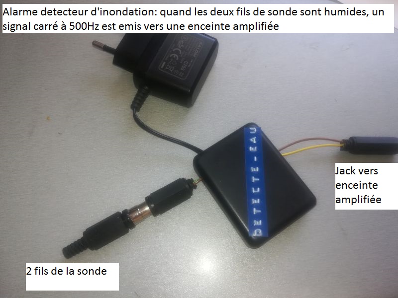 L’Arduino détecte la presence d’eau et émet alors un signal carré à 500Hz vers l’entrée jack d’une enceinte amplifiée ( ou un buzzer si l’on est à proximité).