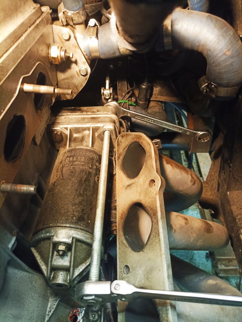 gauche, sous l’auto, pendant que l’on pousse la gaine dans le fouillis de tubes