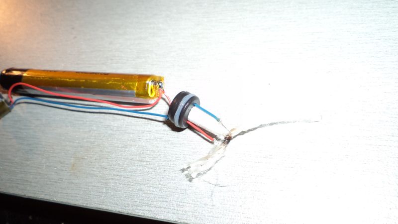 — il connecte la pile (3V environ, 1 W.h)à un fil