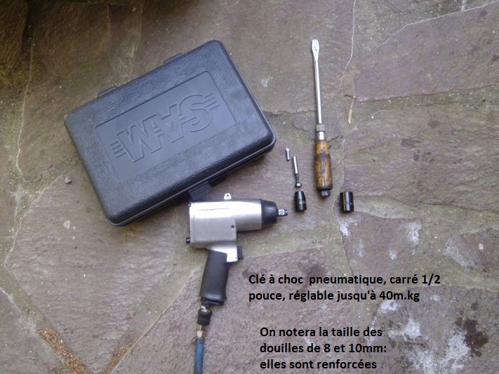 Une clé à choc pneumatique comme celle ci, se contente d’un petit compresseur de 120 l/mn (2200W) et le couple réglable atteint 40m.kg.