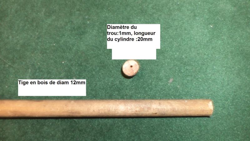 L’orifice calibré officiel a été remplacé par un cylindre en bois ( morceau de tourillon de diamètre 12 mm ) de longueur 20 mm ou 25 avec un trou de 1 mm de diamètre.