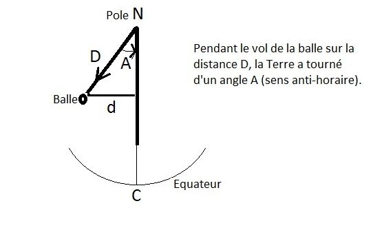 Pendant le temps t, la balle a volé la distance D =v*t, et la Terre a tourné dans le sens anti-horaire, d’un angle A que nous allons calculer.