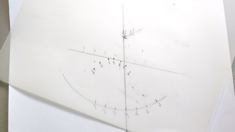 En tournant le calque (sens anti-horaire) on amène le 6 du cercle sur la droite.On trace au crayon sur le calque le point à l’aplomb du repère 6 sur la droite.
