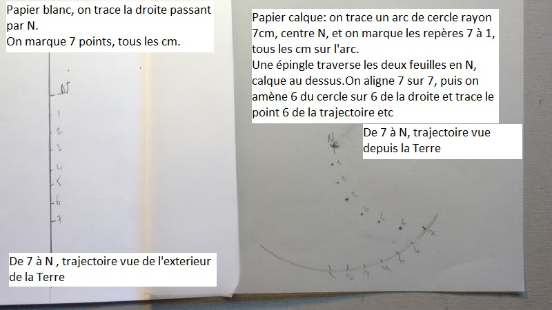 Plus généralement, on trace une droite quelconque ne passant pas par N et la gradue de 7 à 1 comme ci dessus.L’épingle toujours en, place, on fait tourner le calque et trace la trajectoire vue de la Terre : on constate qu’elle est systématiquement courbée vers sa droite.