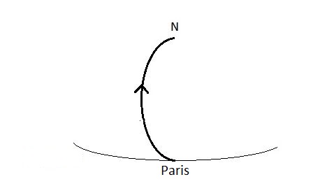 Philippe, ton commentaire au dessus de cette 2è figure est trompeur car il donne l’impression que tu traites le cas inverse du 1er cas à savoir un tir Equateur > pôle Nord le tireur pointant son fusil vers le pôle Nord, alors que ce n’est pas ce que montre la figure. En particulier la phrase « Le tireur est maintenant à Paris et vise le pôle nord » n’est pas exacte. Il aurait fallu dire : "Le tireur est à Paris et il veut que sa balle arrive sur le pôle Nord" Et justement pour cela il ne faut pas qu’il VISE le pôle Nord mais « Un peu plus à l’Ouest » comme dirait le professeur Tournesol