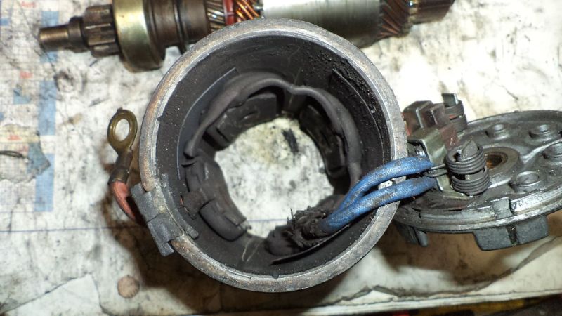 Noter que dans les démarreurs plus récents, ces enroulements sont remplacés par 4 aimants permanents, ce qui simplifie le stator qui ne comporte plus donc que les 2 balais.