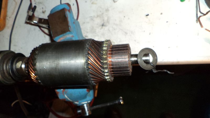 On commence par vérifier l’isolation des spires par rapport à la masse, c’est à dire une lamelle du collecteur et la masse : elle doit être de plusieurs dizaines de millier d’ohm, ici 32 000 ohms. En cas de court-circuit, le rotor doit être remplacé.