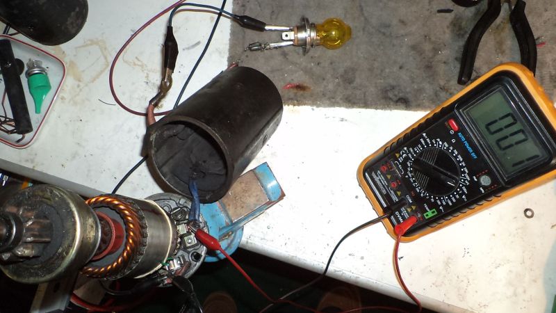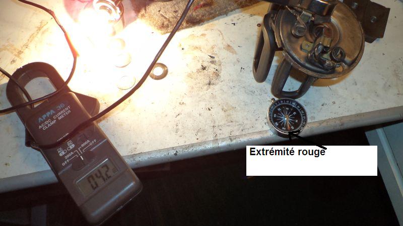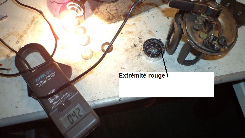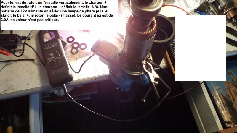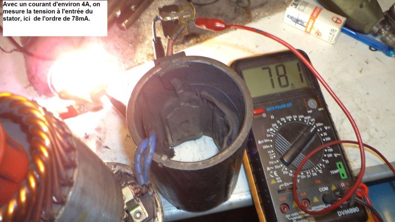 Ensuite on connecte une lampe de phare ( 50/55W soit environ 4 A sous 12 V)en série avec le stator ( D sur le schéma )