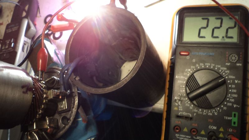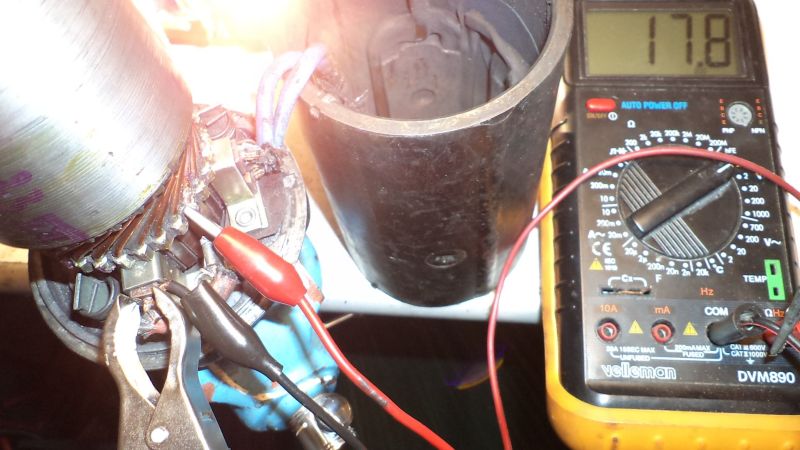 Si la tension est correcte,mais qu’il tourne avec peine, vérifier la consommation ( le courant absorbé ) avec un ampèremètre à pince : si on trouve plus de 250A, c’est probablement à cause de spires du rotor en court-circuit. Il faut tester le rotor comme indiqué ci dessous.