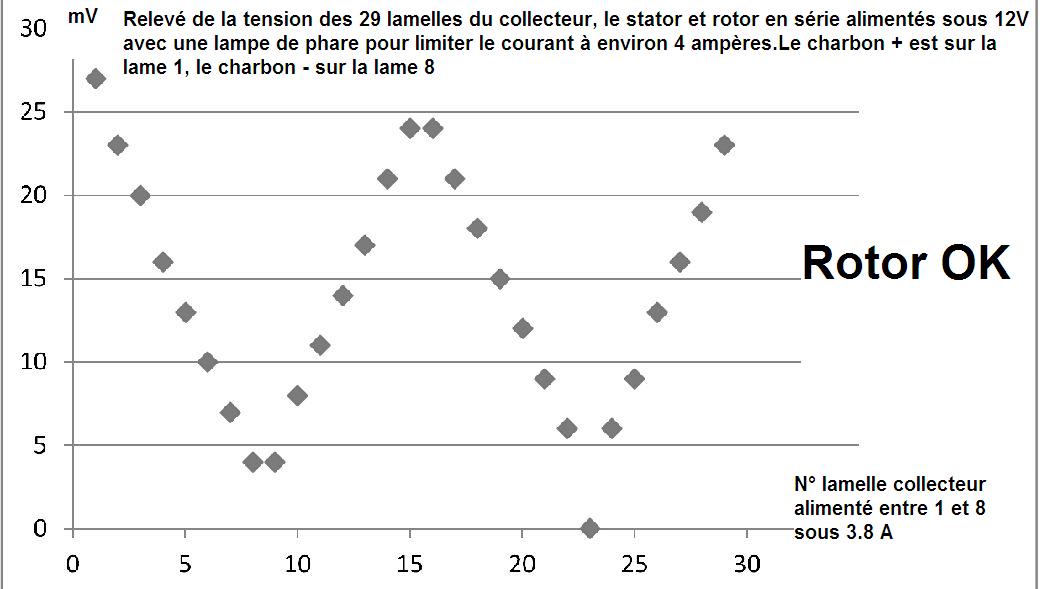A défaut de grognard, j’ai étudié en détail le bobinage du rotor et propose la méthode ci dessous qui ne demande qu’un simple voltmètre standard, calibre 200 mV, courant continu.