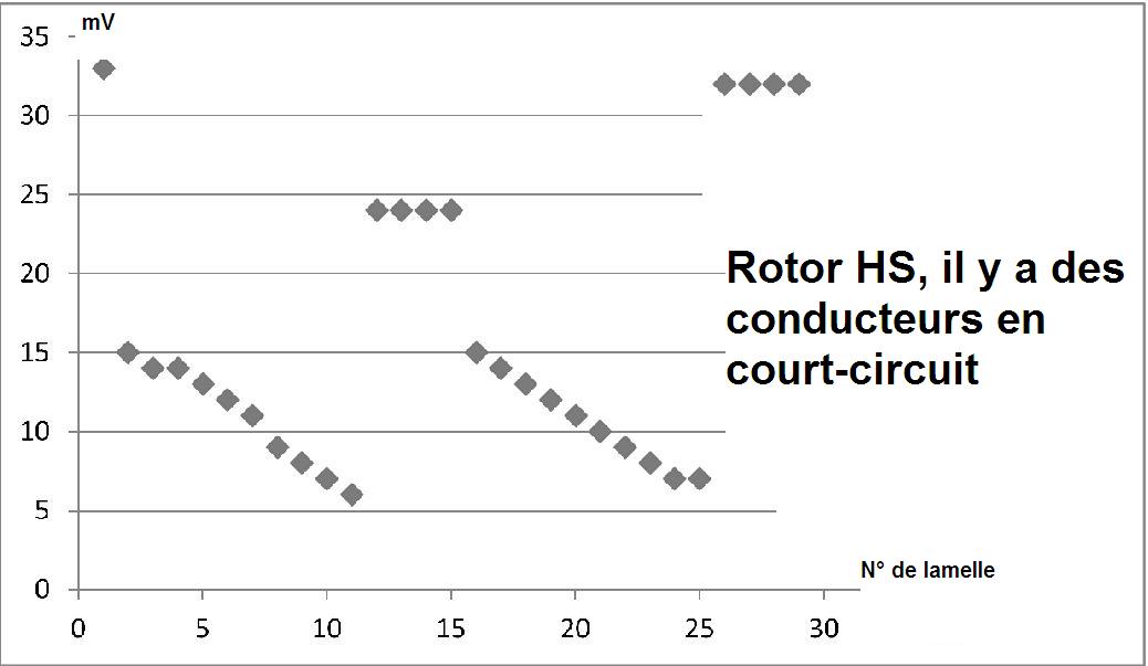 Les 2 possibilités principales de défaut pour un rotor sont : la mise en court-circuit de spires par un vernis défaillant et, moins probable, un mauvais sertissage de l’extrémité des spires sur le collecteur.