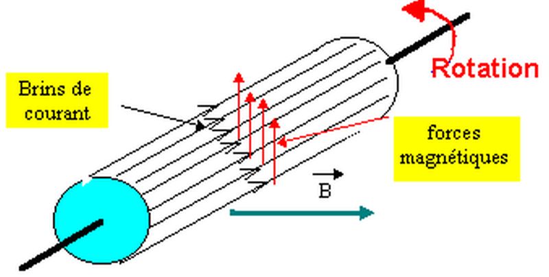 Ce schéma montre comment une force ( dite de Lorentz ou Laplace ) est générée quand un conducteur ( les brins de courant ) se déplace dans un champs magnétique B. La force est perpendiculaire à la fois au champ magnétique B et aux conducteurs. Elle est donc tangente au rotor et le fait tourner.