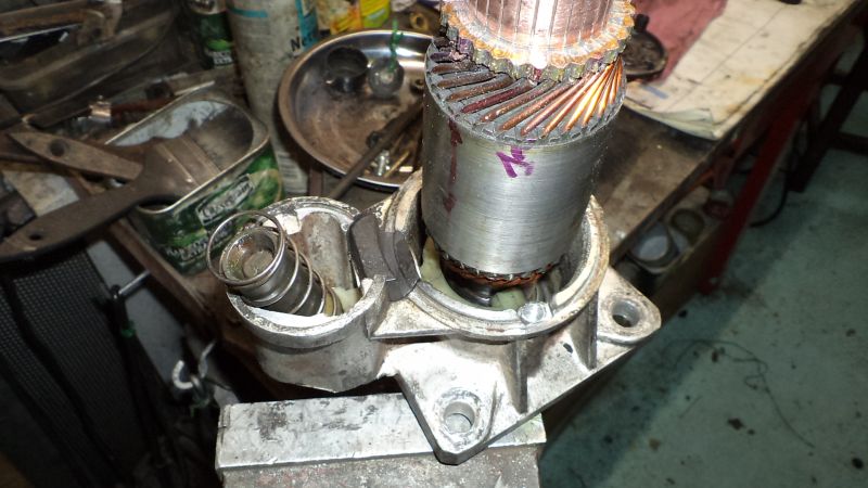 Elle consiste à frapper le démarreur (alimenté) avec un marteau ou autre objet métallique qu’on a sous la main. On entend dire que cela « débloque le lanceur ». Voilà ce qui se passe en réalité : Les charbons se sont usés peu à peu. Lorsque l’un d’eux ne fait plus contact, c’est parce qu’il est à une distance infime du collecteur, puisque l’usure a été progressive.