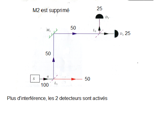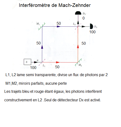 Venant de l’axe x, les deux bras étant de longueur identique, un photon en état superposé traverse les deux branches puis se recombine en interférant sur L2 constructivement, déclenchant le détecteur Dx exclusivement.