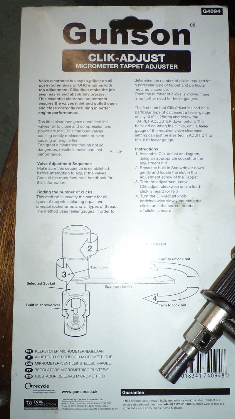 Ce gadget est conçu pour régler le jeu aux soupapes en vissant la vis de culbuteur d’un nombre déterminé de ’clics’ sans insérer de cale (sauf pour son étalonnage).L’outil classique de réglage est de ce type