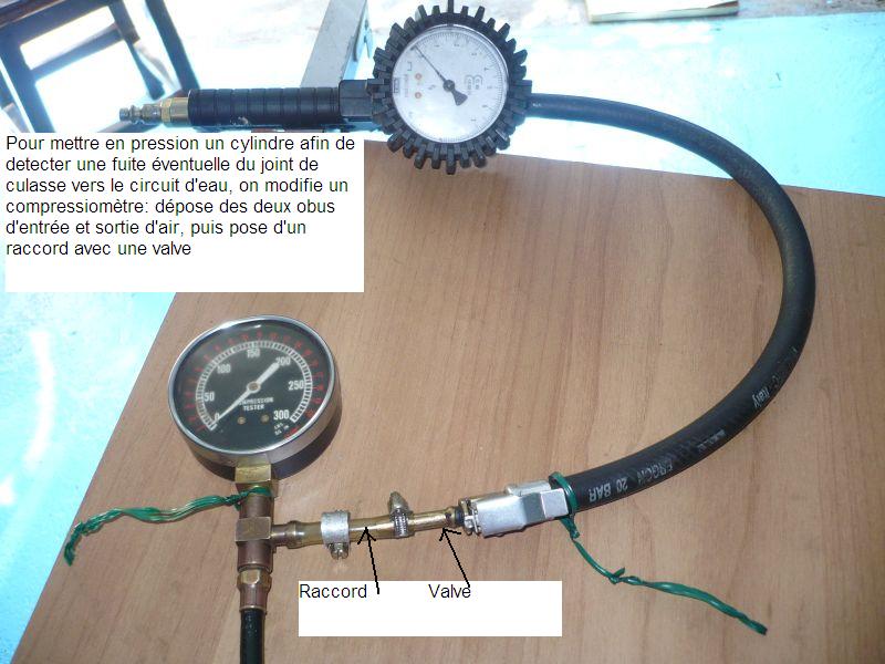 Pour détecter une fuite éventuelle du joint de culasse vers le circuit de refroidissement, il est utile de mettre chaque cylindre sous un pression d’air de quelques bars (au point mort haut allumage, bien sur, quand les soupapes ont fermées).