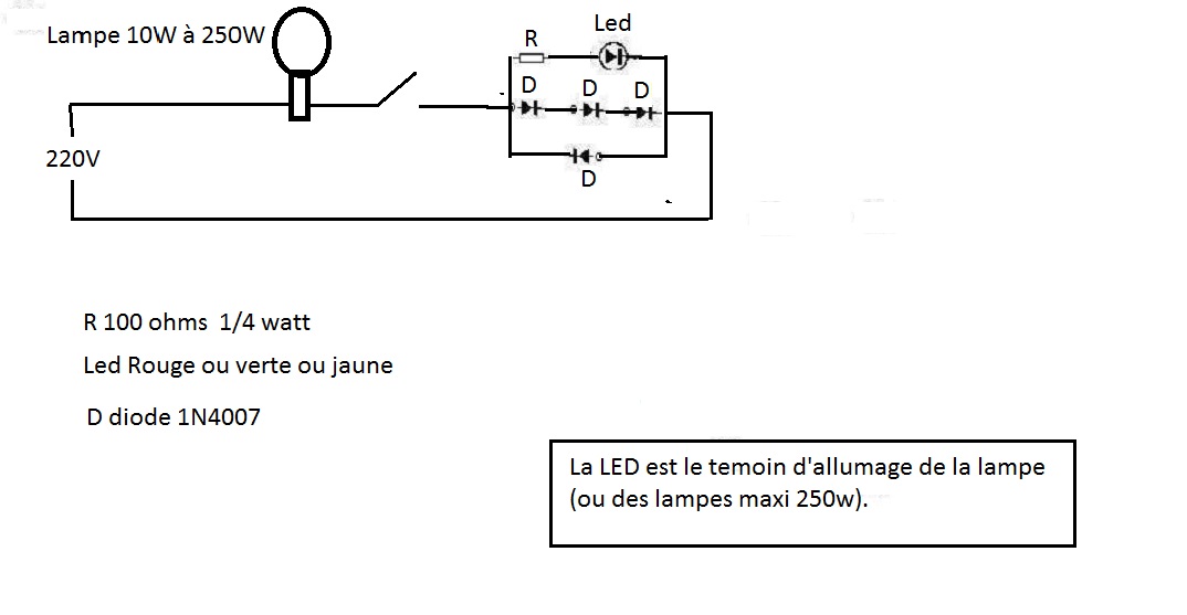 Un moyen simple de détecter le courant passant dans la ou les lampes commandées par cet interrupteur est d’utiliser 3 diodes en série.
