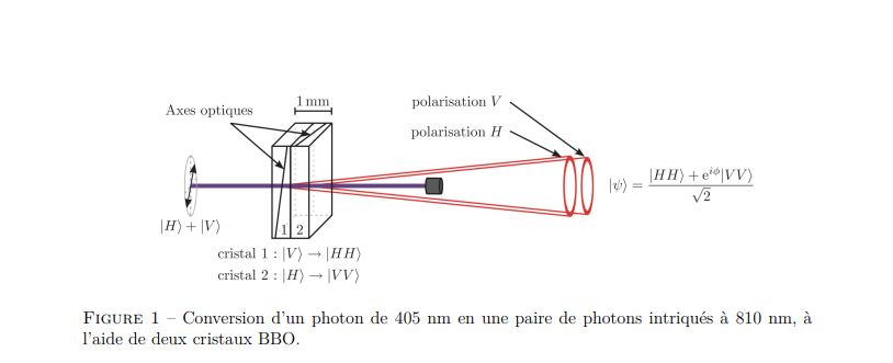 (l’intrication et la séparation des photons se fait à travers un cristal non linéaire BBO, voir l'annexe).