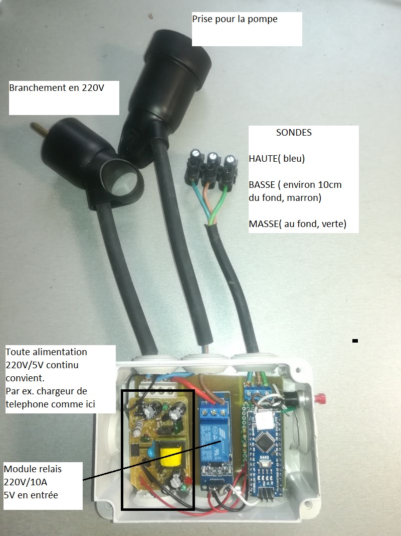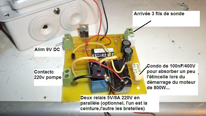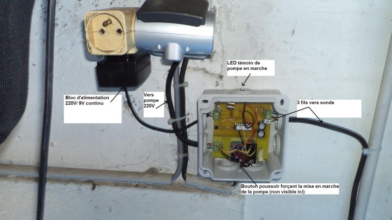 Le flotteur est bloqué en position haute en permanence, le rôle de l’électronique est de commander un relais qui ferme ou ouvre un des fils du 220V alimentant la pompe.
