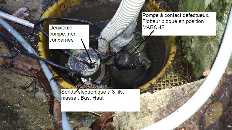 Au fil des temps l’interrupteur interne s’est détérioré avec comme conséquence la pompe restant en marche continue bien que le flotteur soit retombé.