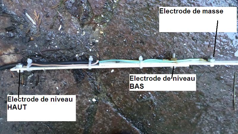 — enfin au niveau HAUT (ici 25 cm au dessus du niveau BAS) c’est l’électrode qui commande la mise en marche de la pompe lorsqu’elle est immergée.