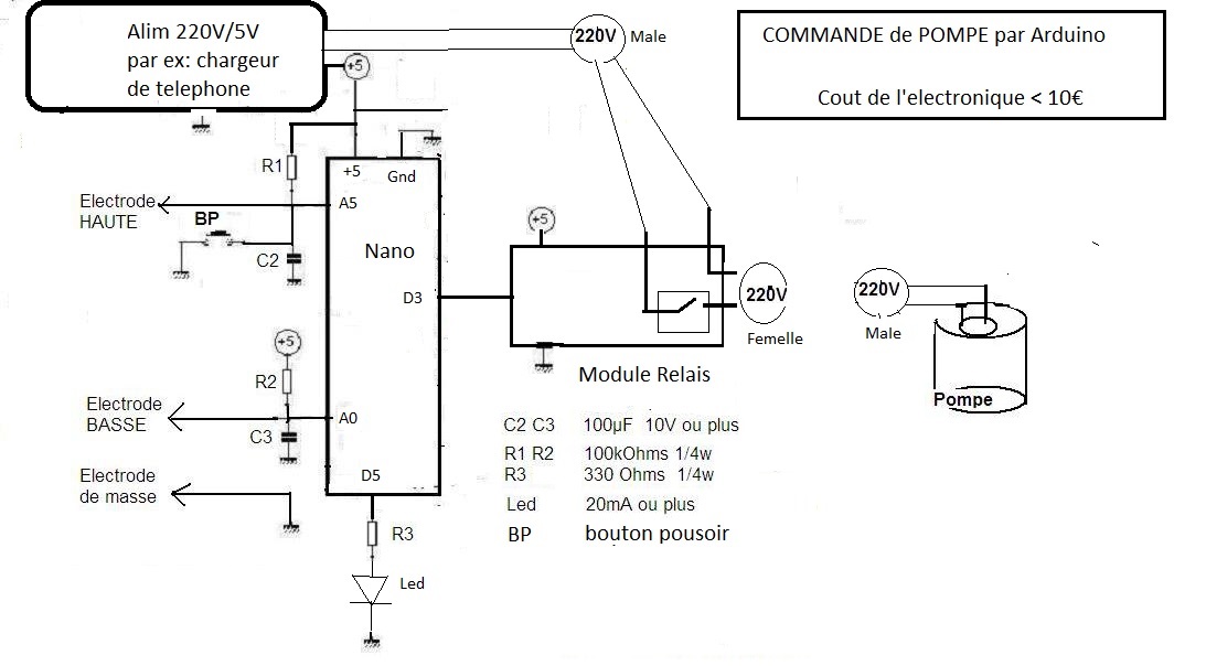 Bonjour, je n’ai pas encore essayé votre montage qui me parait simple et efficace, j’aurais juste une question : les électrodes sont connectées au +5v par 100kohm et à la masse par 100microfarad , ça me parait beaucoup , ça ne crée pas une tempo à l’arrêt de la pompe ? ce ne serait pas 100nano F ?