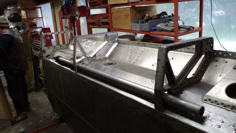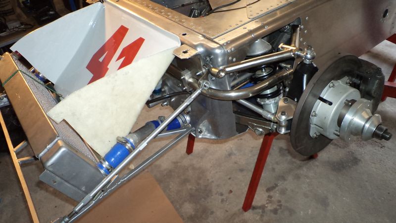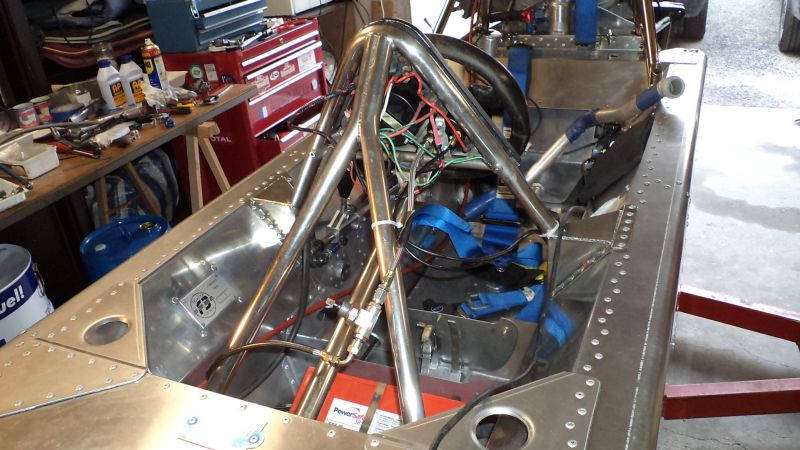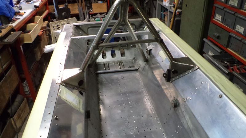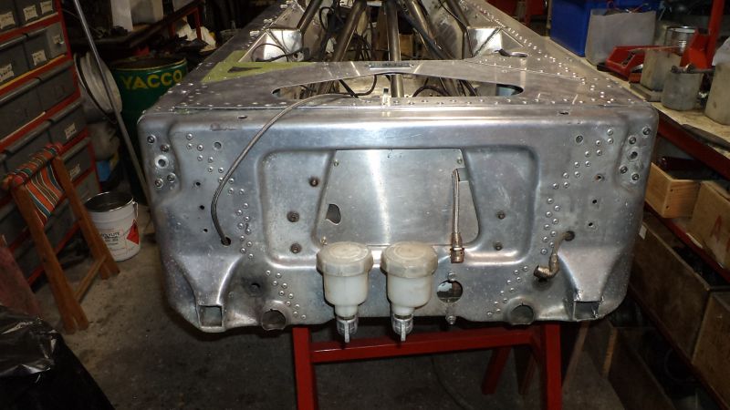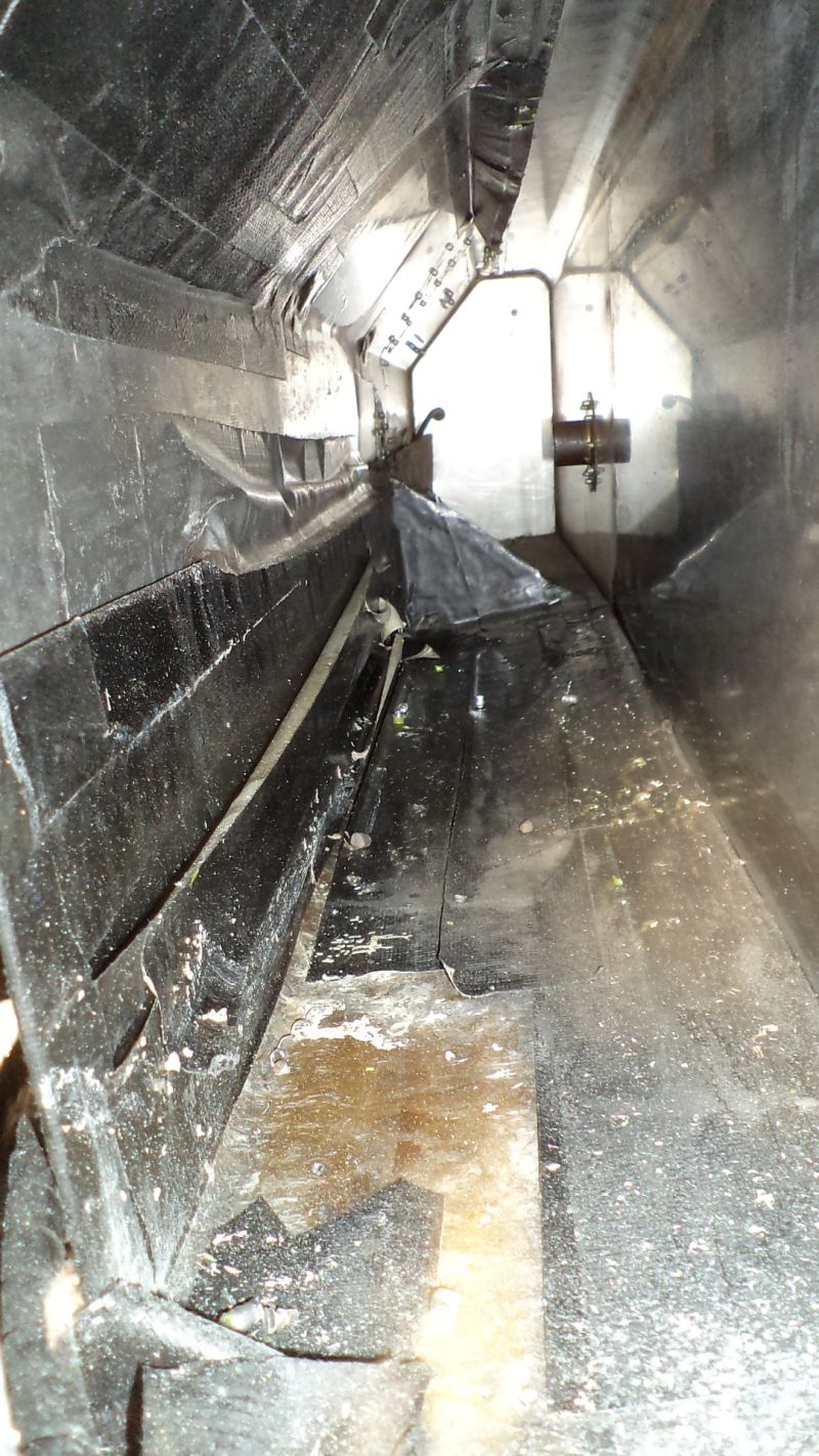Vue de l’intérieur des caissons qui contiennent le reservoir souple, les tubes d’eau, le flexible vers les freins arrière.
