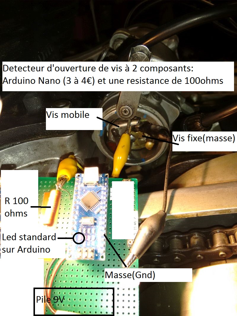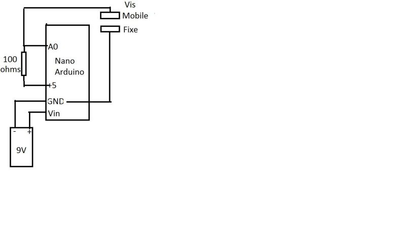Le principe est d’alimenter les vis par un courant de 50 mA.Celui ci est généré par le +5V régulé du Nano et une resistance de 100 ohms, le tout étant alimenté par une pile de 9V (6 V serait aussi OK)