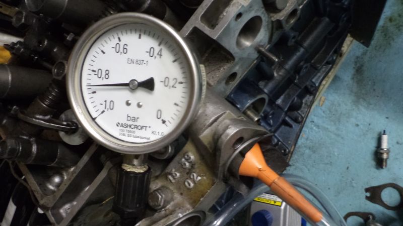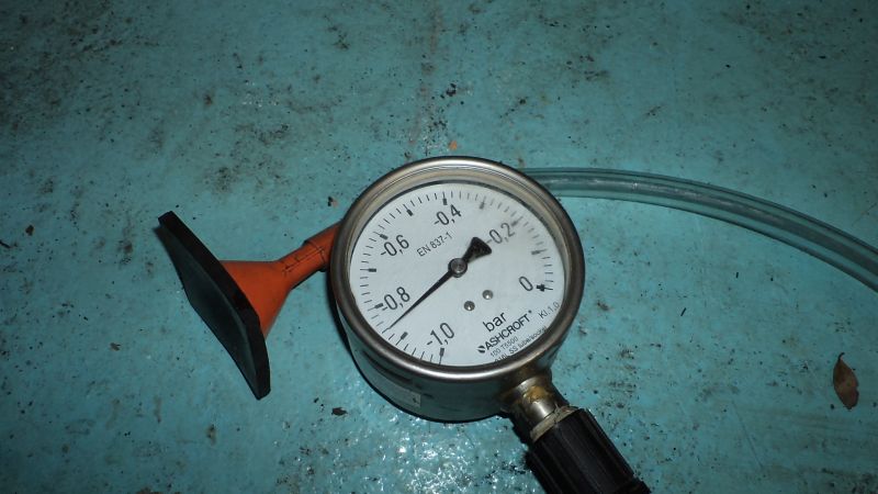 Evidemment, le moteur est au PMH allumage sur cette photo et on voit que la soupape d’admission est bien étanche car on mesure un vide de -0.85 bar ( 65 cm de mercure si on préfère).