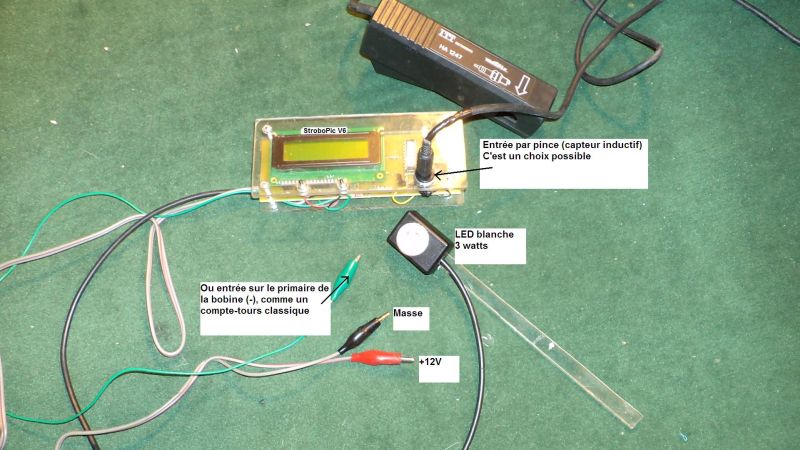 On voit les connexions classiques : +12V, masse, flash, une pince inductive enfichée dans son jack sur la platine mais aussi la pince croco verte que l’on peut connecter sur le -bobine (idem le compte-tours d’origine qui s’y trouve déjà en général).