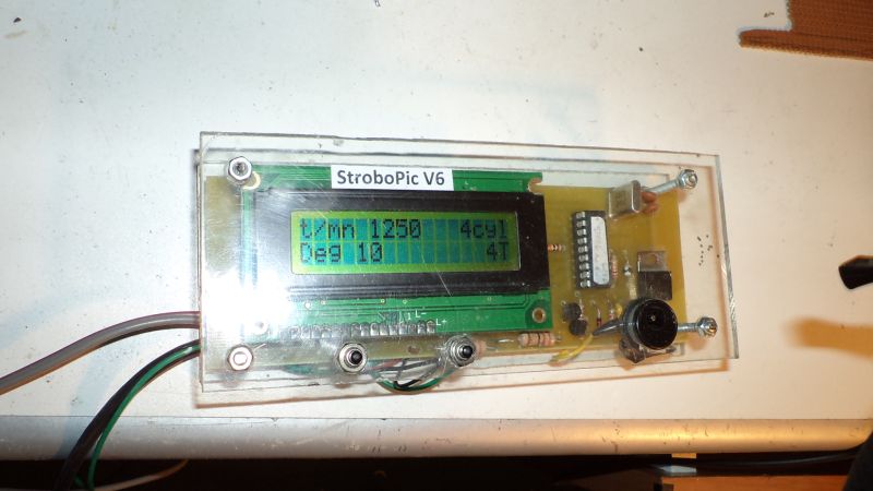 Le boîtier comporte 2 lignes d’affichage à cristaux liquides (LCD), rétro-éclairé. La première ligne indique N entre 400 et 6500 t/mn, avec une définition de 2 t/mn. La deuxième ligne indique D entre 1° et 50° (Voir les photos ci -après). On dispose de deux boutons poussoirs pour déplacer le repère mobile vers la gauche ou vers la droite, et éventuellement un interrupteur pour moteurs 2 temps ou 4 temps.
