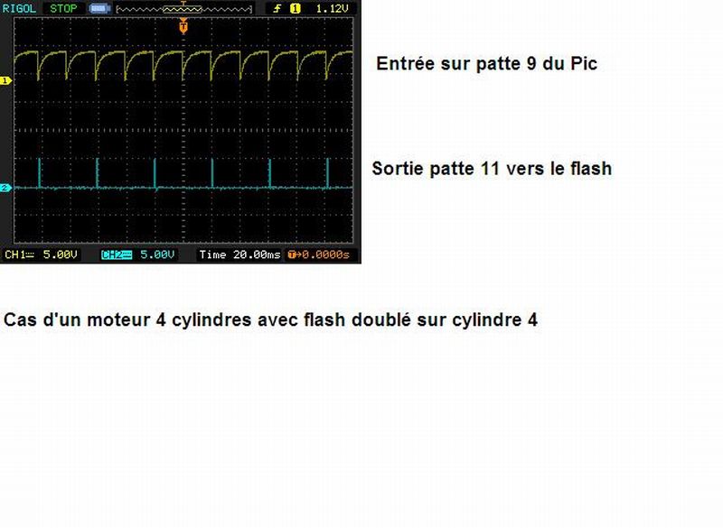 Ce front descendant crée une interruption au niveau du PIC, qui exécute alors l’ISR (Interrupt Service Routine) implantée à l’adresse 4 en ROM. La durée T entre deux étincelles est mesurée par le Timer0 du PIC, qui est donc une seconde source d’interruption. L’ISR fait le tri entre ces deux sources.