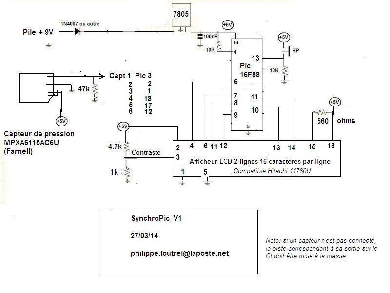 Le Pic ( microcontroleur 16F88 ) lit ces valeurs via son convertisseur analogique numérique, les multiplie par un coefficient de conversion en mm de mercure et enfin les affiche sur le LCD.
