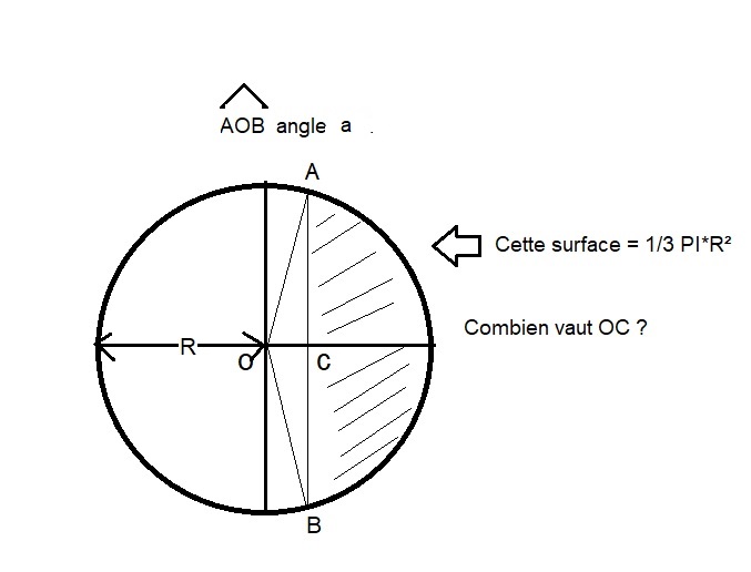 On cherche donc à calculer la valeur de OC, sachant que l'aire du segment vaut R²/2( a – sin a), a exprimé en radian.